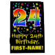 Den här roligten, en levande och färglös presentväska med födelsedagstext har ett stort nummer "24" med en regnbågsspektrumgradient stil mönster, tillsammans med meddelandet "Lycklig 24:e födelsedagen" och en anpassningsbar mottagare namn. Den har också en färgstark bakgrund i mönster med stjärnformer av olika storlek. En dylik presentpåse på födelsedagen kan användas när en gåva eller present i firande på någons 24-årsdag är ge. [~Z0000510]