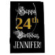 Den här finare och presentsäcksdesignen för årsdagen innehåller meddelandet "Lycklig 24:e födelsedagen" och en redigerbar mottagare namn. En del av budskapet finns i en opulent text skript-stil, det stora talet "24th" har ett faux/imitation guld-inspirerat utseende mönster, och bakgrunden är färgadens svarta. En dylik presentpåse på födelsedagen kan användas när en gåva eller present i firande på någons 24-årsdag är ge. [~Z0000560]