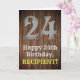 Denna amerikanska Vilda western inspirerade och land inspirerade till en födelsedagskalematerad hälsningskortdesign med ett stort strålande utseende "24", meddelandet "Lycklig 24:e födelsedag", ett eget namn och en faux-/imitationskärna från trä inspirerade till mönster. Insidan har ett hälsning-meddelande på personligens födelsedag, eller kan kanske tas bort och lämnas tomt om ett meddelande ska skrivas för hand i stället. Ett sådant här hälsningskort för personligens födelsedag kan skickas i firande på någons tjugofjärde födelsedag. [~Z0000469]