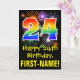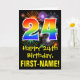 Framsidan av denna spännande, roligt- och färgstarka födelsedagskalenderdesign har ett stort nummer "24" med en regnbågsspektrumövertoning som inspirerade mönster, tillsammans med budskapet "Lycklig 24:e födelsedagen" och en personlig mottagare namn. På fronten finns dessutom ett färgstarkt brinnande, berömda fyrverkerier som inspirerat mönster. Insidan innehåller ett hälsning-meddelande från personligens födelsedag, eller kan kanske tas bort och lämnas tomt om ett meddelande ska skrivas för hand i stället. Ett sådant här födelsedagskort i personligen kan vara ett roligt för att skicka ett meddelande om att fira någons tjugofjärde födelsedag. [~Z0000442]
