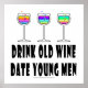 DRINK OLD VIN, DATE YOUNG MANAR Ett humoristiskt cocktailcitat från Martini Diva med tre färgstarka glasögon från vin fyllda med regnbåge av Vino. Perfekt för firande, Bachelor eller Möhippor i vin eller lycklig eller någon cocktail i party. Underbar för vin smak och vinerier.