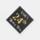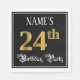 This opulent and ornate birthday paper napkin design features a customizable name and the message “24th Birthday Party”. The large number “24th” has a faux/imitation gold-inspired coloring pattern, and the words “Birthday Party” are in elegant script-style text. The background is colored black by default (although it can be customized). Luxurious, elegant paper napkins like this might be useful to have at a birthday party being held in celebration of somebody’s twenty fourth birthday. [~Z0000565]