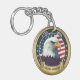 Background: The eagle is superimposed over a circular American flag design with a blue field of stars and red and white stripes.