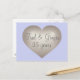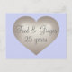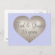 vykortet har ett silver-hjärta med ett vitt tvättat center som innehåller malltext för namn på bruden och brudgummen och ord "25 år" i ett kursivt silver-teckensnitt. Klicka på "Anpassa det!" om du vill flytta silver-hjärtat, ändra färg i bakgrunden och anpassa texten storlekt/på nytt. Baksidan av vykortet är tom och väntar på personligens text eller handskrivna känslor. Välj teckensnitt stil och färg, justera storlek text och layout. Underbar för 25:e bröllop-årsdagen firande spara-till-datum.