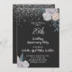 En elegant inbjudan till 25-års silverbröllopsfest med silverglitter på svarta och vita rosor blomsterkanter och en vit script typografi.