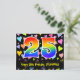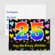 Framsidan av denna kärleksfulla, roliga och färgglada födelsedagstemanpassade vykortdesign har ett stort nummer "25" med ett regnbågsspektrum-gradering inspirerat mönster. Den har också meddelandet "Happy 25th Birthday," och ett anpassningsbart mottagarnamn. Framsidan har dessutom ett livfullt och färgglatt kärleksfullt hjärtmönster i bakgrunden. Baksidan har ett anpassat födelsedagsmeddelande, eller kan kanske rensas och lämnas tomt om ett meddelande ska skrivas för hand istället. Ett personligt födelsedagsvykort som detta kan vara ett roligt sätt att skicka ett meddelande för att fira någon:s tjugofemte födelsedag. Vykort som detta kan också användas för att inbjuda gäster till en födelsedags