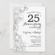 Svart Vit Blommig 25-års bröllopsjubileumspartajsinbjudan. Modern minimalist design med botaniska konturteckningar och typsnittsmanuskript. Elegant inbjudningskort perfekt för en stilig firande. Kan anpassas till vilket äktenskapsår som helst. Tryckta Zazzle-inbjudningar eller direktnedladdningsbar digital utskriftsmall.