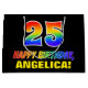 Den här färgstarka, glada och roligt födelsedagskalematerade presentsäcksdesignen har ett stort nummer "25" och meddelandet "GRATTIS PÅ FÖDELSEDAGEN", som båda har en regnbågsspektrumövertoning som inspirerade mönster-färgning, tillsammans med en fet gult anpassade mottagare namn. Bakgrunden är svart på färgad. En roligt presentsäck av det här slaget kan användas när man slår in gåvor som ges till någon i firande på deras 25-årsdag. [~Z0000477]
