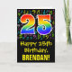 Framsidan av den här roligten, färglös och livfull gratulationskortsdesign med födelsetal har ett stort nummer "25" med en regnbågsspektrumövertoning som inspirerat mönster. Det innehåller också budskapet "Lycklig 25:e födelsedag" och en personlig som tar emot namn. På framsidan finns också en färgstark musik noter och symboler mönster. Insidan innehåller ett hälsning-meddelande från anpassningsbarnas födelsedag, eller kan kanske tas bort och lämnas tomt om ett meddelande ska skrivas för hand i stället. Ett sådant här födelsedagskort i anpassadet kan vara ett roligt för att skicka önskemål till en musiker, sångare, kompositör eller någon annan som firar sin tjugofemte födelsedag. [~Z0000420]