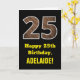Den här roligten har ett stort nummer, 25, med en fejkad träkornig inspirerad mönster på framsidan. På framsidan finns också hälsning:s födelsedagsmeddelande "Lycklig 25:e födelsedag" och en personlig som får namn. Insidan innehåller ett hälsning-meddelande från anpassningsbarnas födelsedag, eller kan kanske tas bort och lämnas tomt om ett meddelande ska skrivas för hand i stället. Ett sådant här födelsedagskort i anpassadet kan vara ett roligt för att skicka ett meddelande i firande om någons tjugofemte födelsedag. [~Z0000433]