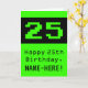 Den här nonsens- och roligtens födelsedag med hälsningskortet har ett stort datorspel med grönt stil nummer "25" på framsidan. Det innehåller också hälsning:s födelsedagsmeddelande "Lycklig 25:e födelsedag" och ett anpassade namn. Insidan innehåller ett hälsning-meddelande från anpassningsbarnas födelsedag, eller kan kanske tas bort och lämnas tomt om ett meddelande ska skrivas för hand i stället. Ett sådant här hälsningskort för roligtar och gäsningar kan användas för att skicka ett hälsning-födelsedagsmeddelande som hedrar 25-årsdagen av en datorprogrammerare, en systemadministratör eller någon som uppskattar klassiskt datorspel. [~Z0000430]