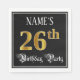 Den här pappra napkin-designen med ornitalt och elegant-format har personligen namn och meddelandet "26:e Födelsedagsfesten". Den stora siffran "26:e" har faux/imitation guld-inspirerad färg mönster, och ord "Födelsedagsfest" finns i texten finare-skript-stil. Bakgrunden är färgadens svarta som standard (även om den kan anpassas). Finare, sådana här opulenta pappra blöjor kan vara bra att ha på en födelsedagsfest/firande för att fira någons 26-årsdag. [~Z0000565]