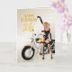 En flicka med en motorcykel som pekar på grattis på födelsedagenmeddelandet. Ett underbart kort för manen som älskar hans cyklar!