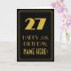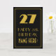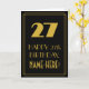 Den här vintagen/retrostil och 1920s-1930s-eran med stil inspirerad matematisk hälsningskortdesign på födelsedagen har en stor konsthandling som ser inspirerad ut som nummer "27", meddelandet "LYCKLIG 27:e BIRTHDAY,", ett eget namn och ett gräns mönster som består av tunna linjer på framsidan. Bakgrunden till framsidan är svart färgad. Insidan har ett hälsning-meddelande på personligens födelsedag, eller så kan det kanske rensas och lämnas tomt om ett meddelande ska skrivas för hand i stället. Ett sådant här hälsningskort för personliger kan användas för att erkänna någons tjugosjunde födelsedag. [~Z0000499]