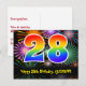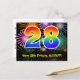 Framsidan av denna spännande, roliga och färgglada födelsedagstematiska postkortsmall har en stor siffra "28" med ett regnbågsspektrum-gradering-mönster, tillsammans med meddelandet "Grattis på 28-årsdagen", och ett redigerbart mottagarnamn. Framsidan har dessutom ett livfullt och färgglatt bakgrundsmönster inspirerat av utseendet på sprängande festliga fyrverkerier. Baksidan har ett anpassat födelsedagsmeddelande, eller skulle eventuellt kunna tömmas och lämnas tomt om ett meddelande ska skrivas för hand istället. Ett anpassningsbart födelsedagskort som detta kan vara ett roligt sätt att skicka ett meddelande för att fira någon som fyller 28 år. Postkort som detta kan också användas för att inbjuda gä