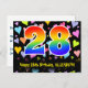 Framsidan av denna kärleksfulla, färgglada och spännande födelsedagstema postkortsdesign har en stor siffra "28" med ett regnbågsspektrum-gradering inspirerat mönster, tillsammans med meddelandet "Grattis på 28-årsdagen", och ett personligt mottagarnamn. Framsidan har dessutom ett livfullt och färgglatt kärleksfullt hjärtformigt bakgrundsmönster. Baksidan har ett redigerbart födelsedagsgratulationsmeddelande, eller kanske kan rensas och lämnas tomt om ett meddelande ska skrivas för hand istället. Ett personligt födelsedagskort som detta kan vara ett roligt sätt att skicka ett meddelande för att fira någon som fyller 28 år. Postkort som detta kan också användas för att bjuda in gäster till en födelsed