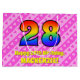 Lycklig och den 28:e födelsedagskalematerade presentsäcksdesignen har ett stort nummer "28" med ett mönster inspirerat av ett regnbågsspektrum. Det innehåller också budskapet "Lycklig 28:e födelsedag", följt av en personlig namn. Bakgrunden är en glad mönster av mörkens rosa och ljust rosa rand som innehåller levande hjärtformer av rosa. En presentpåse som denna kan användas när man slår in presenter eller gåvor som ges till heder för någons tjugoåttonde födelsedag. [~Z0000414]
