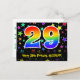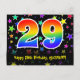 Framsidan av denna färgglada, roliga och spännande födelsedagsteman postkort design har en stor siffra "29" med ett regnbågsspektrum gradient-inspirerat mönster. Den har också meddelandet "Grattis på 29-årsdagen" och ett anpassningsbart mottagarnamn. Framsidan har dessutom ett livfullt och färgglatt bakgrundsmönster med stjärnformer i olika storlekar. Baksidan har ett anpassat födelsedagsmeddelande, eller kan kanske lämnas tom om ett meddelande ska skrivas för hand istället. Ett personligt födelsedagskort som detta kan vara ett roligt sätt att skicka ett meddelande för att fira någon:s tjugonionde födelsedag. Postkort som detta kan också användas för att bjuda in gäster till en födelsedagsfest