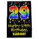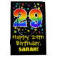 Den här färgstarka, roligt- och spännande presentsäcksdesignen på födelsedagen har ett stort nummer "29" med en regnbågsspektrumövertoning för stil mönster, tillsammans med meddelandet "Lycklig 29:e födelsedagen", och en anpassade som tar emot namn. Den har också en bakgrund i mönster med stjärnformer av olika storlek och färg. En dylik presentpåse på födelsedagen kan vara ett roligt sätt att figurera en gåva eller present som ges för att fira någons 29-årsdag. [~Z0000510]