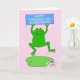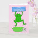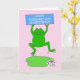 En jättestor tecknad groda som hoppar över ett mycket stort näckblad och en vit blomma, mot en pastellrosa bakgrund. Grodan håller en blå rektangulär skylt som säger 'Grattis på 29 februari födelsedagen'.