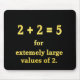 I gultens text föreslås humoristiskt att 2+2 är lika med 5 under vissa villkor. Uttrycket innebär att matematik används på ett lekfullt sätt med en twist.Ett humoristiskt matematiskt uttryck lyder "2 + 2 = 5" i gult mot en vit bakgrund. Chuckle och leende med matematisk precision med detta nonsens numeriska uttryck.