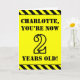 Framsidan på denna roliga och iögonfallande födelsedagskortdesign har ett anpassat namn och meddelandet "NU ÄR DU 2 ÅR!" i svart stencil-inspirerad text på en gul bakgrund. Det finns också ett iögonfallande mönster med gula och svarta ränder längst upp och ned på framsidan. Insidan har ett anpassat födelsedagsmeddelande, eller kan eventuellt lämnas tom om ett meddelande ska skrivas för hand istället. Ett födelsedagskort som detta kan vara ett roligt sätt att skicka födelsedagsönskningar till någon som firar sin andra födelsedag.