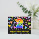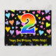 Framsidan av denna roliga, färgglada och spännande födelsedagskortdesign har en stor siffra "2" med ett regnbågsspektrum-gradering-mönster, tillsammans med meddelandet "Grattis på 2-årsdagen," och ett personligt mottagarnamn. Framsidan har dessutom ett livfullt och färgglatt kärleksfulla hjärtformigt bakgrundsmönster. Baksidan har ett redigerbart födelsedagsgratulationsmeddelande, eller kanske kan rensas och lämnas tomt om ett meddelande ska skrivas för hand istället. Ett personligt födelsedagskort som detta kan vara ett roligt sätt att fira någon på deras andra födelsedag. Postkort som detta kan också användas för att bjuda in gäster till en födelsedagsfest som hålls för någon som fyller 2 år