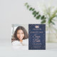 Meddela den glada nyheten om en kommande studentfest med moderna 2-foto "save the date" postkortinbjudningar. Texten på denna mall är enkel att anpassa med examenens namn, examensår och andra meddelandedetaljer. Färgerna, typsnittsstilar och överlagringsopacitet kan enkelt anpassas med Zazzle Design Editor-verktyget. Den marinblå och rosa guld designen har en falsk glittermössa, en enkel modern konfettikant, stilren vintage typografi, elegant klassisk script kalligrafi och två bilder som du väljer, till exempel seniorbilder eller bilder från examensceremonin. Observera att det rosa guldet är tryckt färg, inte metallfolie eller glitter. Dessa "save the date"-kort för studentfirande är ett elegant sätt att dela en speciell dagsfirande med familj och vänner. Grattis till