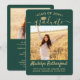 Dela glädjen av en gymnasie- eller högskoleexamen med dessa anpassade 2-foto gröna och gyllene meddelanden. (TIP FÖR BILDPLACERING: Ett enkelt sätt att centrera en bild exakt som du vill är att beskära den innan du laddar upp den till Zazzle-webbplatsen.) Denna mall innehåller examenens namn, klassår och skola, och är enkel att anpassa med valfri formulering, till exempel detaljer om festinbjudan, föräldrarnas namn, särskilda utmärkelser, examina, favoritcitat, examenens kontaktinformation, framtida utbildningsplaner eller nytt jobb. Om det finns någon text som inte önskas, raderas den helt enkelt. Designen har en grön ombre-bakgrund, falsk folie-mössa, handskriven stilkalligrafi, modern minimalistisk typografi och två bilder som du väljer, till exempel seniorbilder eller bilder från examensceremonin. Observera att guld är tryckt färg, inte metallfolie. Dessa eleganta examensannonser är ett trendigt och snyggt sätt att dela din speciella
