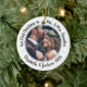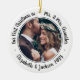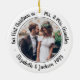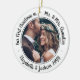 Fira en glatt första helgdag som gift par med ett foto av anpassningsbar 2: "Vår första jul som Mr. Och Mrs." runda keramiska prydnadsföremål. All text och bilder på den här mallen är enkla att anpassa och kan vara olika eller likadana framifrån och bakåt. (IMAGE & TEXT DESIGN TIPS: 1) Lägg till blanksteg i början eller slutet om du vill justera skrivläget. 2) Om du vill centrera fotot exakt så som du vill kan du placera det i kvadratisk form innan du laddar upp det till Zazzles webbplats.) Utformningen har en snyggt med modern minimalistisk svartvit gräns, handskriven kalligrafi för stil-skript namn & år och två bilder efter eget val. Denna unika bröllop-keepsaké tillför en elegant till de nya Julafton-dekorationerna. Exempelbilden är av Tim Stagge (Källa: @tim_stagge on Unsplash).