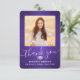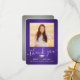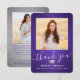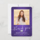 Skicka ett stilfullt tack med anpassade 2-foto lila, silver och vita examens-tack-kort. Alla bilder och texter är enkla att anpassa. (TIP FÖR BILDPLACERING: Ett enkelt sätt att centrera ett foto exakt som du vill är att beskära det innan du laddar upp det till Zazzle-webbplatsen.) Denna mall kan anpassas med valfri text du vill ha, till exempel framtida utbildningsplaner, nytt jobb eller favoritcitat. Om du hellre vill skriva ditt meddelande för hand, radera bara exempeltexten eller använd utrymmet ovanför den nya adressen och kontaktinformationen. Designen har en lila falsk borstad rostfritt stål-bakgrund, falsk folie-mössa, handskriven stilspråk-kalligrafi, modern minimalistisk typografi och två foton som du väljer, till exempel seniorbilder eller bilder från examensceremonin. Observera att silver är tryckt färg, inte metallfolie. Dessa eleganta personliga kort är ett trendigt och chic sätt att tacka familj och vänner för att de delade din examensfir