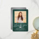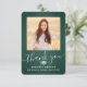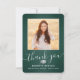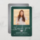 Skicka ett tacksamhetsmeddelande med anpassningsbar 2-fotot mörk grönt, silver och vitt studenten-tackkort. Alla bilder och formuleringar är enkla att anpassa. (IMAGE PLACEMENT TIP: Ett enkelt sätt att centrera ett foto exakt som du vill är att flytta det till skörd innan du laddar upp det till Zazzle-webbplatsen.) Den här mallen kan anpassas med valfri ordalydelse, t.ex. framtida utbildningsplaner, nya befattningar eller favoritinspirationstecken. Om du föredrar att lämna skriva till ditt meddelande tar du bara bort exempeltexten eller användan över utrymmet ovanför ny adress- och kontaktinformationen. Utformningen har en mörk grönt bakgrund av rostfritt stål, granatkork av typen faux foil mortar board, handskriven kalligrafi av stil, modern minimalistisk typografi och två foton som du själv väljer, t.ex. äldre bilder eller bilder från startceremonin. Observera att silver är tryckt på färg, inte metallfolie. Dessa kort för personlig i elegant är ett trendig- och chic sätt att tacka familj och vänner för att de har delat med sig av studenten firande. Grattisar till student!