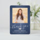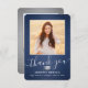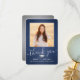 Skicka ett tacksamhetsmeddelande med anpassningsbar 2-fotomarinblått, silver och vitt studenten-tackkort. Alla bilder och formuleringar är enkla att anpassa. (IMAGE PLACEMENT TIP: Ett enkelt sätt att centrera ett foto exakt som du vill är att flytta det till skörd innan du laddar upp det till Zazzle-webbplatsen.) Den här mallen kan anpassas med valfri ordalydelse, t.ex. framtida utbildningsplaner, nya befattningar eller favoritinspirationstecken. Om du föredrar att lämna skriva till ditt meddelande tar du bara bort exempeltexten eller användan över utrymmet ovanför ny adress- och kontaktinformationen. Utformningen har en mörk blått bakgrund av rostfritt stål, granatkork av typen faux foil mortar board, handskriven kalligrafi av stil, modern minimalistisk typografi och två foton som du själv väljer, t.ex. äldre bilder eller bilder från startceremonin. Observera att silver är tryckt på färg, inte metallfolie. Dessa kort för personlig i elegant är ett trendig- och chic sätt att tacka familj och vänner för att de har delat med sig av studenten firande. Grattisar till student!