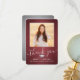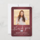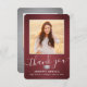Skicka ett tacksamhetsmeddelande med anpassningsbar 2-fotoröda, vita och silver grått-tackkort för studenten. Alla bilder och formuleringar är enkla att anpassa. (IMAGE PLACEMENT TIP: Ett enkelt sätt att centrera ett foto exakt som du vill är att flytta det till skörd innan du laddar upp det till Zazzle-webbplatsen.) Den här mallen kan anpassas med valfri ordalydelse, t.ex. framtida utbildningsplaner, nya befattningar eller favoritinspirationstecken. Om du föredrar att lämna skriva till ditt meddelande tar du bara bort exempeltexten eller användan över utrymmet ovanför ny adress- och kontaktinformationen. Utformningen har en maronburgundröd faux borstad bakgrund av rostfritt stål, grått faux foil mortar board, handskriven stil-manusgrafi, modern minimalistisk typografi och två foton som du själv väljer, t.ex. äldre bilder eller bilder från startceremonin. Observera att silver är tryckt på färg, inte metallfolie. Dessa kort för personlig i elegant är ett trendig- och chic sätt att tacka familj och vänner för att de har delat med sig av studenten firande. Grattisar till student!