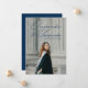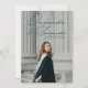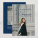 Modern studenten-meddelande med student-lodräts foto med "Onwards and Upwards" i ett handskript i marinen. Anpassa bilden av fotot studenten genom att lägga till student namn, skolan och studenten. Meddelandet återgår till visningen med ett ytterligare foto med students framtida planer, uppgifter om grad party osv. som visas nedan.