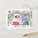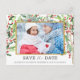Utformningen har vattenfärgen grön holly löv och röd bär som bakgrund. Fotot visas inuti folie ram i guld på framsidan och på baksidan av vykortet. Spara datum och andra detaljer skrivs i modern grått-typografi. Anpassa vykortet för bröllop spara datum i helgdag genom att lägga till information.