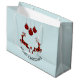 En stor presentsäck som säger "God jul" i böjd text. Designad med en illustration av 2 jultomtens hjort. Hjorten består av rött och svart lumberjack, med lite hjärta mellan dem. Röd och svart plaid Juldekorationer ner från toppen. Ljusblå bakgrund.