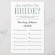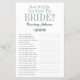 Den här vackra möhippan leker lakan med "Hur gammal var Briden?" på framsidan och "Hur bra vet du att Briden?" på baksidan är enkel och charmerande - perfekt till duschen. Den här roligten och de här enkla spelen kommer säkert att föra med sig mycket skratt till din möhippa! Ha familj och vänner som skickar bilder av bruden till dig i alla olika åldrar och få dem tryckta. Numrera dem och ställ dem nära matchen lakan. Bara ge per lakan till varje gäst (glöm inte pennorna) och låt tävlingen börja för det första spelet! Du kommer att bli förvånad över hur många människor som verkligen känner till brudens ålder. Vänd sedan gästerna i lakan och ge fem minuter för att besvara frågorna. Du får reda på vem verkligen känner till bruden. Om några sekunder kan du se hur ditt spel lakan kommer att se ut. Välj Anpassa den här mallen och skriv i namn i briden.och trimningen.