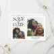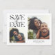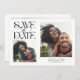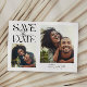 Elegant and modern save the date card featuring a mystical typography text that says "save the date." There are 2 photos on the front and one on the back. The background is white.
