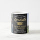 Minneshögtidlighålla student prestation med anpassningsbar 2 fotosvart, guld och vitt kaffe mugg. Bilder och all text är enkla att anpassa. Ta med alla favoritcitat, motiveringsordspråk, namn och examen i skolan, grattisar, tack vare mamma och pappa, eller något annat budskap som du väljer. Utformningen har en svart bakgrund av rostfritt stål, faux foil studentmössa, personlig modern typografi namn, skola och klassår, och två foton som du själv väljer, t.ex. äldre bilder eller bilder från startceremonin. Observera att guld är tryckt på färg, inte metallfolie. Det är en tankfull julklapp och en elegant till hemsdekoration. Grattisar till student!