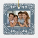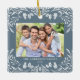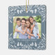 Den här mörken visar dammiga blåa julprydnader en elegant vit vintergrön illustration att ramar fotografierna. Utformningen ger utrymme för 2 bilder, ett på framsidan och ett på baksidan. Anpassa detta vackra prydnadsföremål med din familj namn och året.