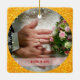 Elegant, chic "Our First Christmas as Mr. and Mrs." personalized photo Christmas ornament for newly married couples, with cursive typography / hand lettering, a frame of white and silver snowflakes and little stars, and one of sparkling (faux) sepia-golden glitter. Make sure you personalize the two photos, the family name (if you wish to replace Mr. and Mrs.), and the year, and on the back, your first name and that of your spouse.