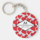 En nyckelkedja med ett upprepat mönster med två röda hjärtan av olika storlek varje hjärta omgiven av ett vitt gräns. En diamantformad ram överst med ditt namn och första inuti.