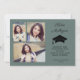 Modern och unik sage/moss/gräs grönt 4-foto-2-sidigt studenten-kort med svart studentmössa och text, "Spara datumet". Personlig med ditt namn i ett typsnitt av eleganten, namn, studenten, datum, tid och plats för studenten, tillsammans med ett meddelande till vänner och familj om att en formell inbjudan kommer att följa. Lägg till 3 foton framtill och 1 på baksidan.