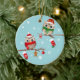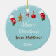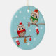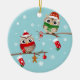 2 ugglor på grenar, som dekoreras med julstrumpor, pepparkaksgubben, candy cane och jul, klumpa ihop sig. Ugglorna har Santa hattar och röda och gröna scarves. Bakgrunden är ljus kricka- och vitsnöflingor. Baksidaen av prydnaden har en strumpa, en candy cane och en pepparkaksgubbe överst och en snöflingor i ljus kricka. Alla av texter är anpassadet.