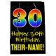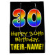 Denna roliga, spännande och färgglada födelsedagstematiska presentpåsdesign har en stor siffra "30" med ett regnbågsspektrum-gradering inspirerat mönster, tillsammans med meddelandet "Grattis på 30-årsdagen," och en personlig mottagares namn. Bakgrunden är svart. En presentpåse som denna kan användas när man förpackar presenter som ges till någon för att fira deras trettioårsdag. [~Z0000512]