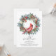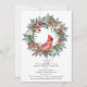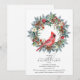 En elegant röd kardinal infälld i en vintergrön krans inbjuder gästerna till din vinter- eller jul-födelsedagsfest. Vattenfärgsdesignen visar en vacker kardinal och en tallkrans dekorerad med röda blommor och bär tillsammans med tallkottar.