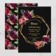 På framsidan: En inbjudan till 30års födelsedag party. En svart chic med faux guld geometric ram. Dekorerad med mörk burgundy och rosa blommor, ro och boho stil fjädrar. Mallar för uppgifter om namn och party. Namn är skrivet med ett handskript i stil, Gulden färgad brev. Bakåt: Svart bakgrund och stort ro i burgundi och Lila.