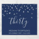 Hjälp henne att fira 30års födelsedag i stil med den här enkla men elegant designen, med faux silver triangular konetti som sipprar ner på ord "trettio" i silver grått-handskriftsteckensnitt på marin blå bakgrund. Anpassa den med honungens namn i silver grått sans serif-typsnitt, tillsammans med tillfälle och datum nedan i mindre grått av silver.