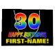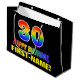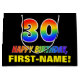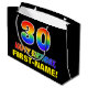 Den här roligten, färglös och glad presentväska med födelsedagstext, har ett stort nummer "30" och meddelandet "GRATTIS PÅ FÖDELSEDAGEN,", båda färgader med en regnbågsspektrumövertoning som inspirerade mönster, tillsammans med en fet gult personlig mottagare namn. Bakgrunden är svart på färgad. En sådan här presentpåse på roligtens födelsedag kan användas när en gåva eller present i firande på någons trettionde födelsedag är ge. [~Z0000477]